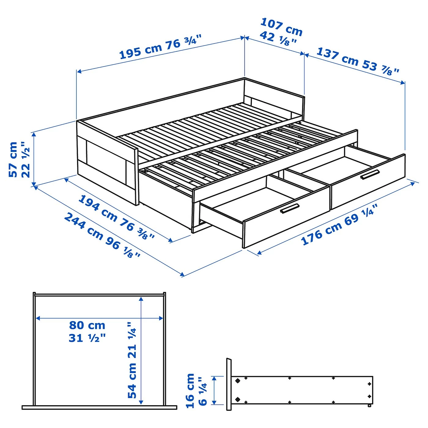 Transform your sofa into a single bed in no time and maximize the use of floor space. Perfect for a teenager’s bedroom or where you don’t have a lot of space. With this daybed you quickly and easily create space for overnight guests. Just pull out the bed base and you get a double bed in no time. The large drawers have space for extra comforters, pillows, linens or other things you need to store, but want to have close at hand. This simple design fits together with many different styles. Keep it the way it is or create a cozy corner with lots of pillows. If you stuff comforters and pillows in large cushion covers, you get both storage and comfortable back support during the day. Both smart and practical.Material
