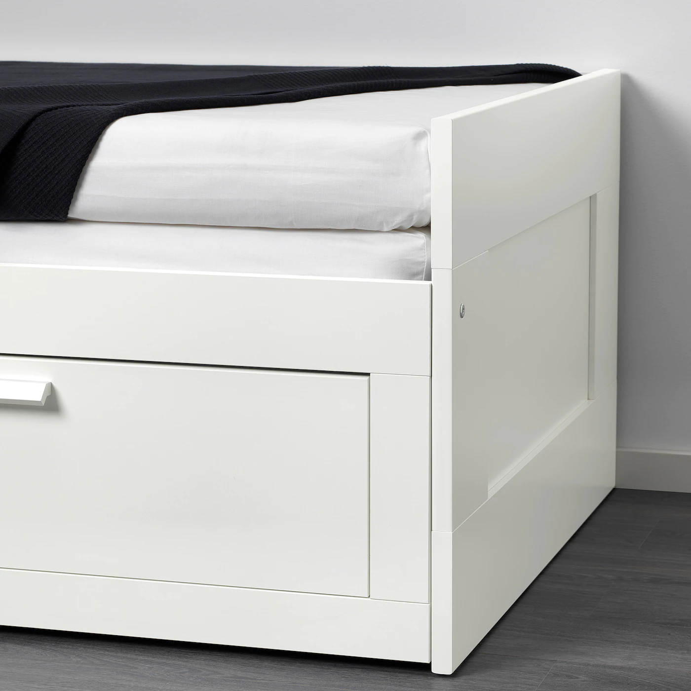 Transform your sofa into a single bed in no time and maximize the use of floor space. Perfect for a teenager’s bedroom or where you don’t have a lot of space. With this daybed you quickly and easily create space for overnight guests. Just pull out the bed base and you get a double bed in no time. The large drawers have space for extra comforters, pillows, linens or other things you need to store, but want to have close at hand. This simple design fits together with many different styles. Keep it the way it is or create a cozy corner with lots of pillows. If you stuff comforters and pillows in large cushion covers, you get both storage and comfortable back support during the day. Both smart and practical.Material