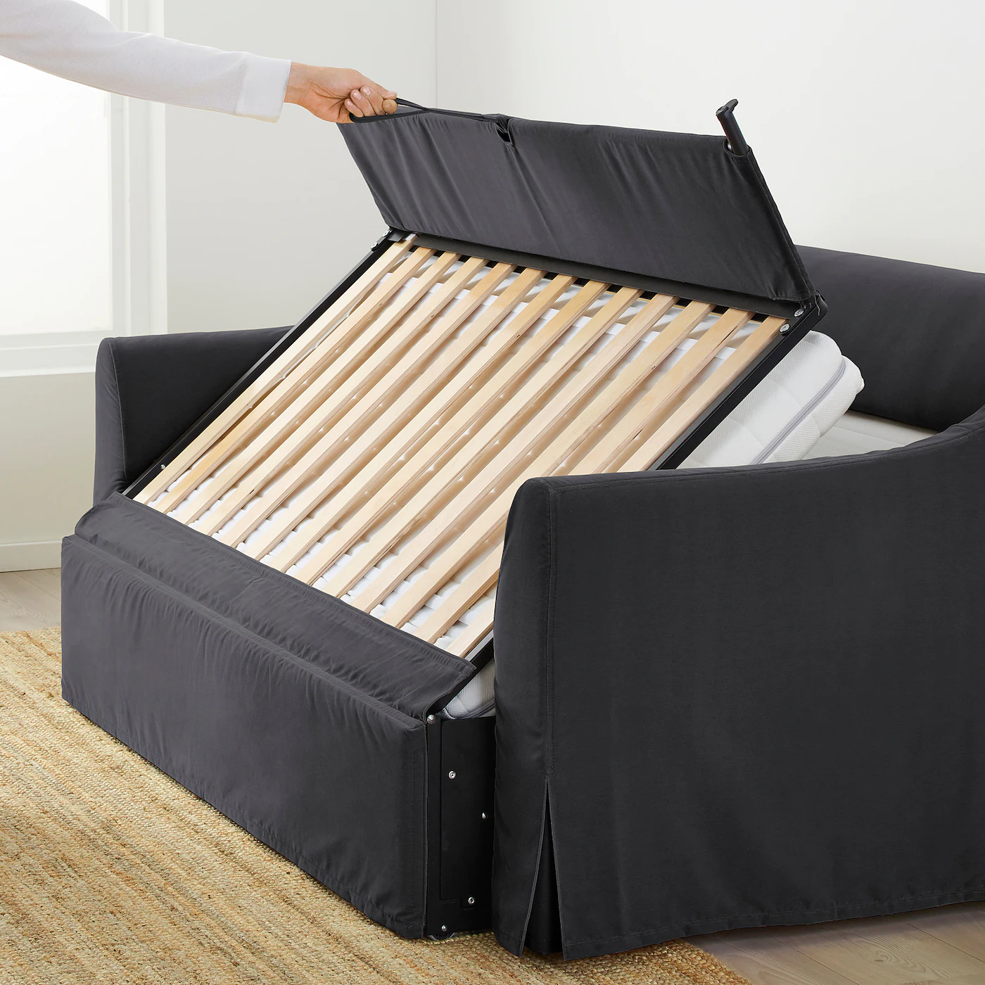 Comfortable to sit in thanks to pocket springs that follow your body and a top layer of ball fiber – and comfortable to sleep on thanks to a thick foam mattress on the slatted bed base.