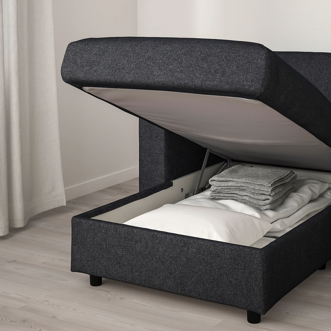 The sofa’s sections can be combined in different ways to get a size and shape that suits you. If you ever need a larger sofa, you can always add a section or two. Storage space under the chaise. The lid stays open so you can safely and easily take things in and out. You can place the chaise section to the left or right of the sofa, and switch whenever you like. The sleeper sofa has a 4¾” thick bed mattress in high resilience foam that provides comfortable support to your body and a smooth sleeping surface without disturbing joints. This sofa converts quickly and easily into a spacious bed when you remove the back cushions and pull out the underframe. You can use the sofa’s back cushions to get a comfortable back support to lean against in the bed. The bed slats work together with the mattress to give a more flexible comfort and nice sleep support. The mattress is easy to keep clean since you can remove the mattress cover and machine wash it. Tallmyra is a hardwearing chenille cover made of cotton and polyester and has a soft surface and a slightly reflective luster. The cover is easy to keep clean since it is removable and machine washable. 10-year limited warranty. Read about the terms in the limited warranty brochure.Material