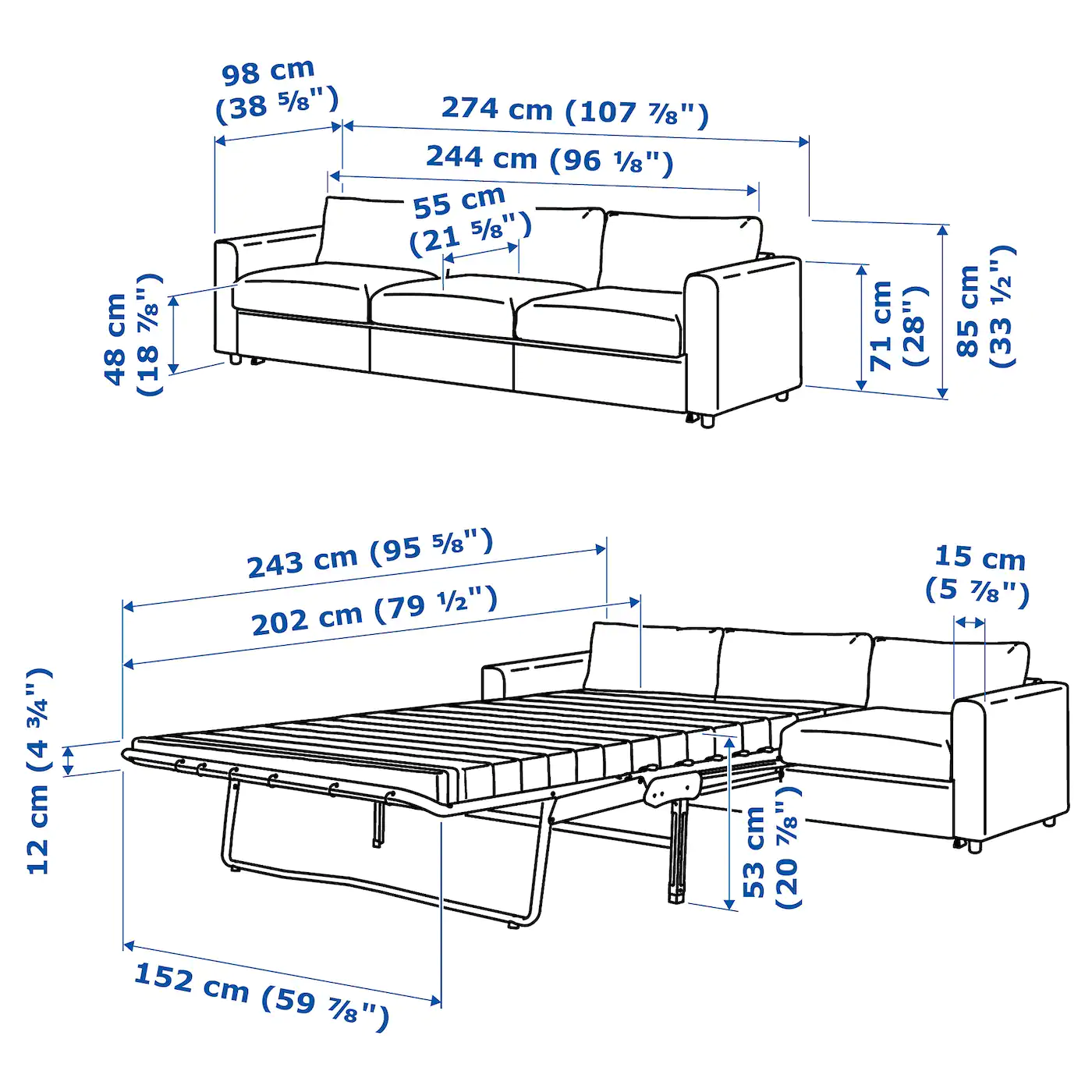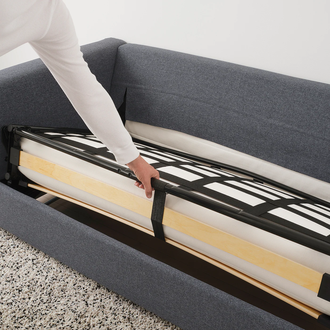 The sofa’s sections can be combined in different ways to get a size and shape that suits you. If you ever need a larger sofa, you can always add a section or two. This cover is made of dope-dyed Gunnared fabric in polyester. It is a durable fabric with a wool-like feel, a warm look and a two-toned mélange effect. The cover is easy to keep clean since it is removable and machine washable. The sleeper sofa has a 4¾” thick bed mattress in high resilience foam that provides comfortable support to your body and a smooth sleeping surface without disturbing joints. The bed slats work together with the mattress to give a more flexible comfort and nice sleep support. This sofa converts quickly and easily into a spacious bed when you remove the back cushions and pull out the underframe. You can use the sofa’s back cushions to get a comfortable back support to lean against in the bed. The mattress is easy to keep clean since you can remove the mattress cover and machine wash it. 10-year limited warranty. Read about the terms in the limited warranty brochure.Material