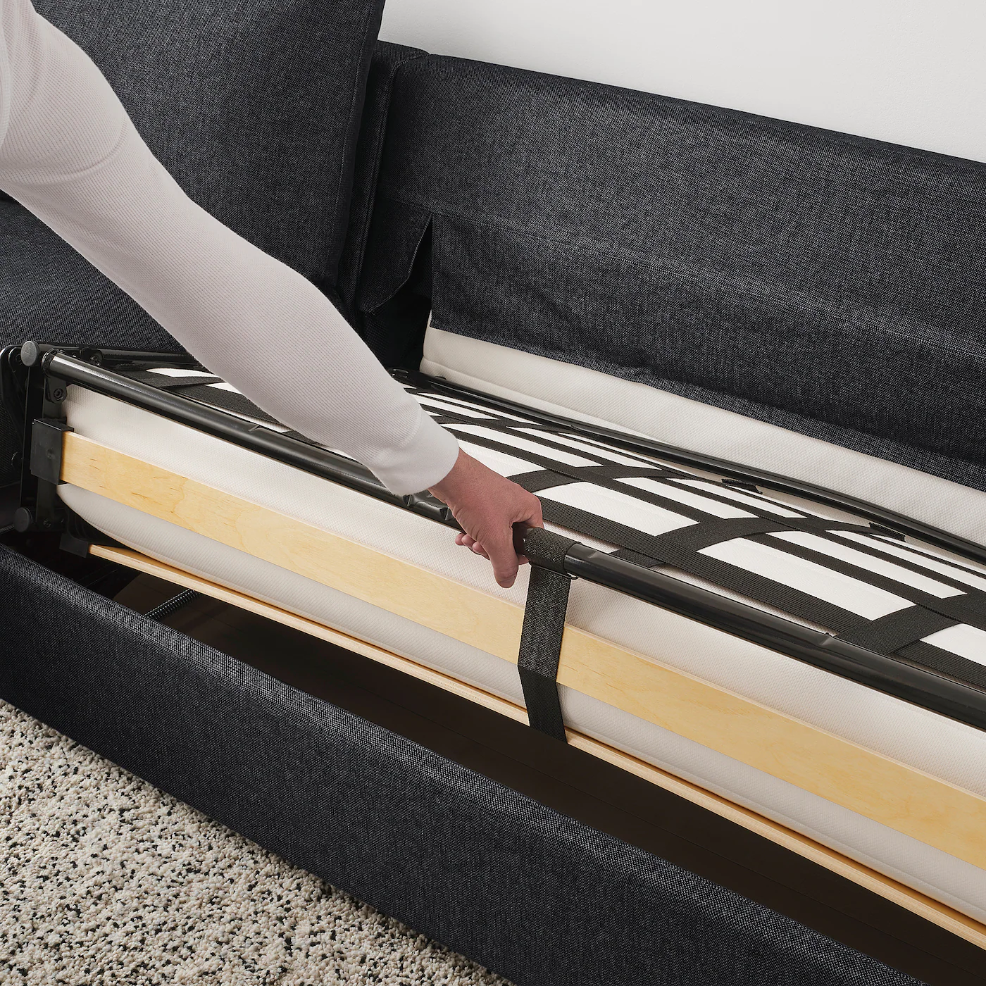 The sofa’s sections can be combined in different ways to get a size and shape that suits you. If you ever need a larger sofa, you can always add a section or two. Storage space under the chaise. The lid stays open so you can safely and easily take things in and out. You can place the chaise section to the left or right of the sofa, and switch whenever you like. Tallmyra is a hardwearing chenille cover made of cotton and polyester and has a soft surface and a slightly reflective luster. The cover is easy to keep clean since it is removable and machine washable. The sleeper sofa has a 4¾” thick bed mattress in high resilience foam that provides comfortable support to your body and a smooth sleeping surface without disturbing joints. The bed slats work together with the mattress to give a more flexible comfort and nice sleep support. This sofa converts quickly and easily into a spacious bed when you remove the back cushions and pull out the underframe. You can use the sofa’s back cushions to get a comfortable back support to lean against in the bed. The mattress is easy to keep clean since you can remove the mattress cover and machine wash it. 10-year limited warranty. Read about the terms in the limited warranty brochure.Material