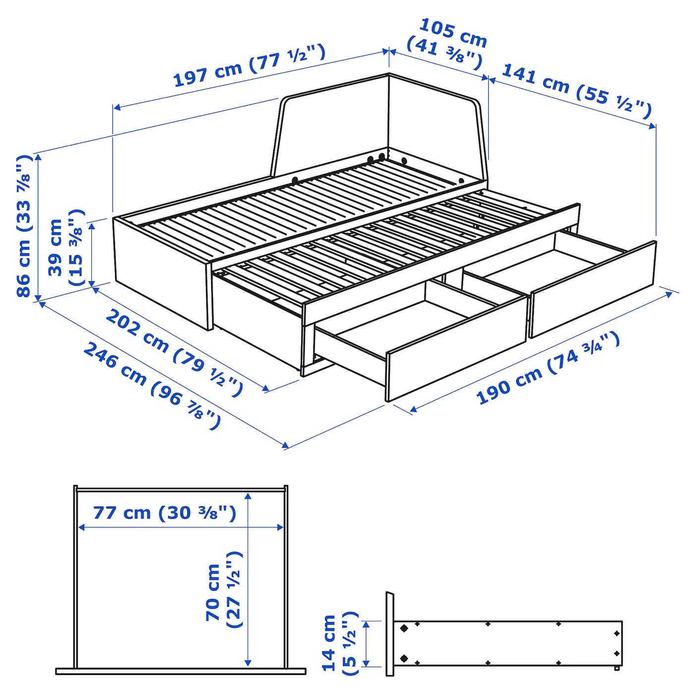 Real wood veneer will make this bed age gracefully. With some soft, fluffy pillows as back support, you easily transform this day bed into a comfortable sofa or chaise. Transform your sofa into a single bed in no time and maximize the use of floor space. Perfect for a teenager’s bedroom or where you don’t have a lot of space. With this daybed you quickly and easily create space for overnight guests. Just pull out the bed base and you get a double bed in no time. The large drawers have space for extra comforters, pillows, linens or other things you need to store, but want to have close at hand. This simple design fits together with many different styles. Keep it the way it is or create a cozy corner with lots of pillows. If you stuff comforters and pillows in large cushion covers, you get both storage and comfortable back support during the day. Both smart and practical. You will get all-over support and comfort with the resilient foam mattress.Material