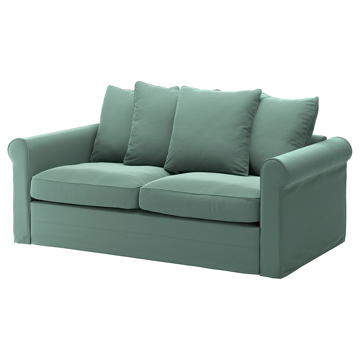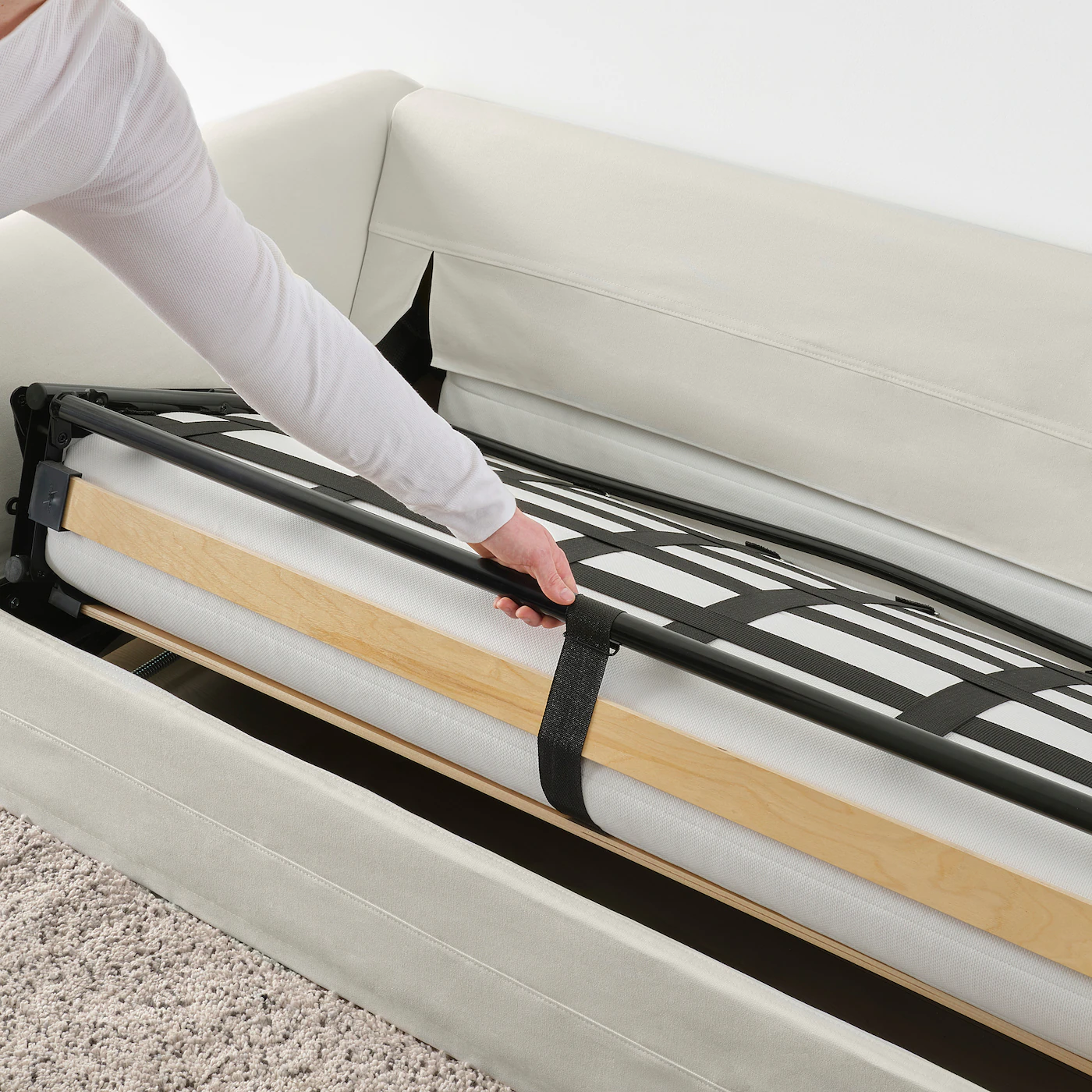 The bed slats work together with the mattress to give a more flexible comfort and nice sleep support. The sofa is quickly and easily transformed into a spacious bed by removing the seat and back cushions and pulling out the underframe. You can use the sofa’s back cushions to get a comfortable back support to lean against in the bed. The mattress is easy to keep clean since you can remove the mattress cover and machine wash it.Material