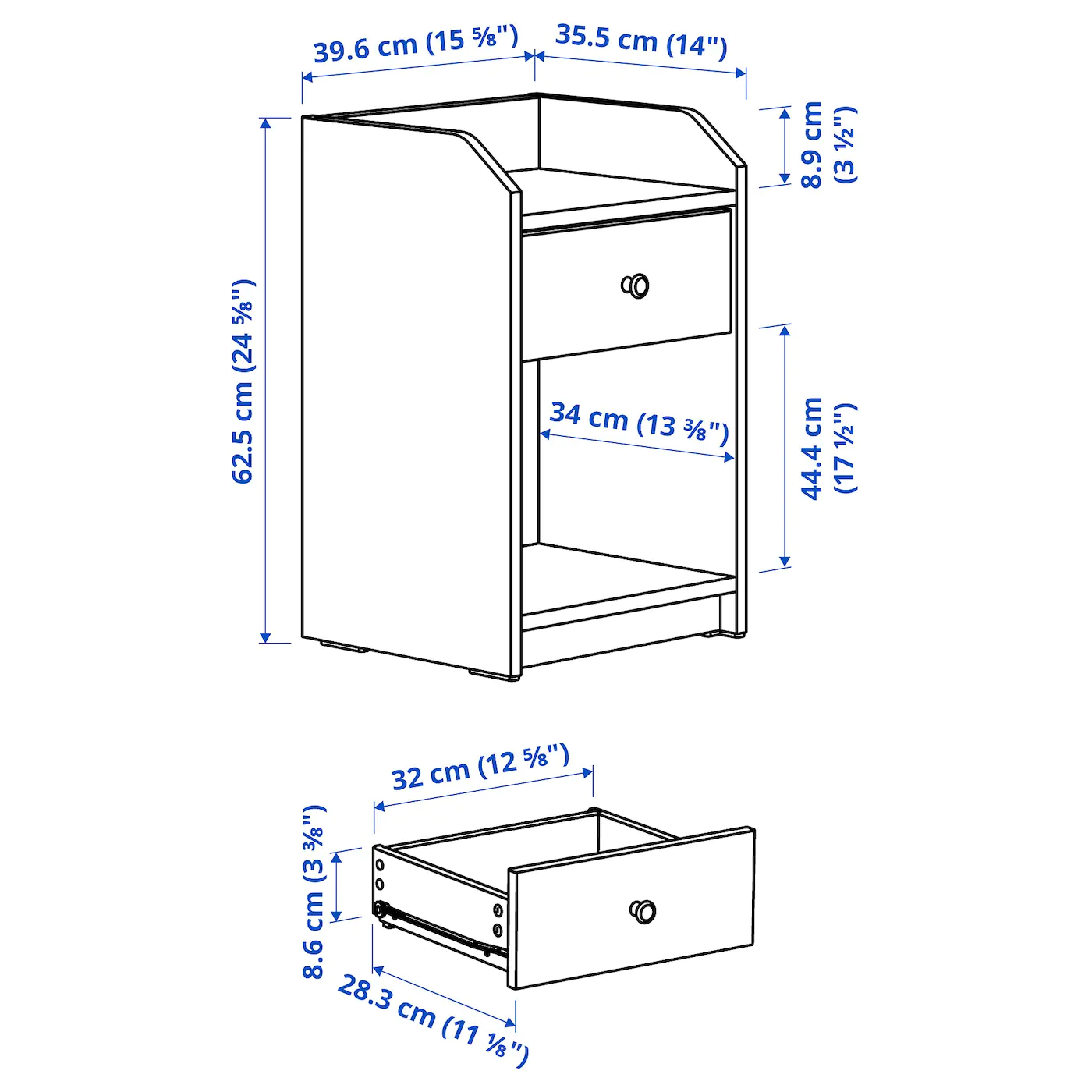 HAUGA bedside table has a top shelf, a handy drawer and an open storage compartment. Everything you need to store items that you want close to the bed.Material
