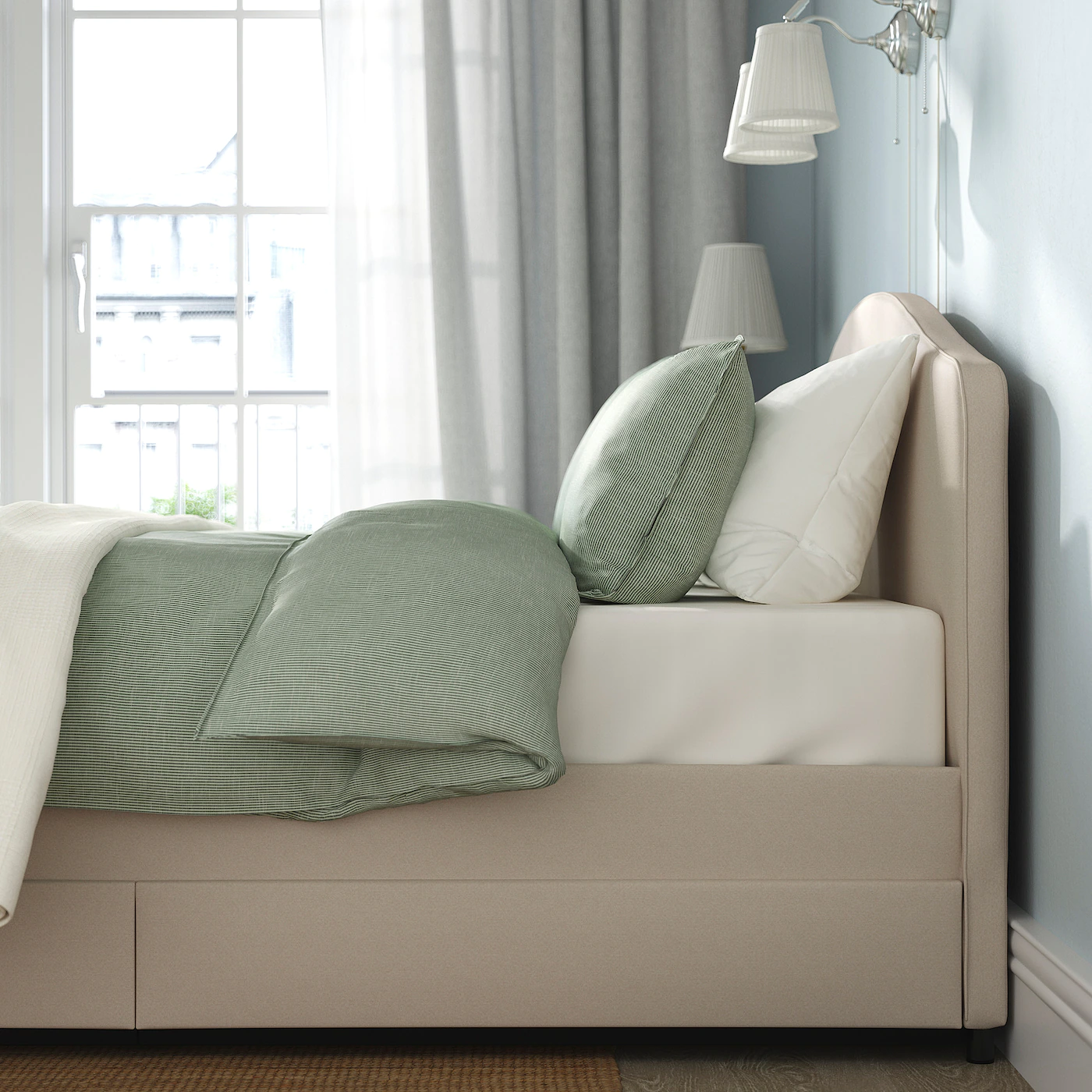Designed to coordinate perfectly with the rest of the HAUGA series, the upholstered bed frame adds a touch of softness to your bedroom, bringing comfort during the night, and adding style around the clock. Casters make the boxes easy to roll out and in. The soft, padded headboard is comfortable to lean against while reading or watching TV in bed. A timeless look with soft upholstery, gentle curves and piping on the headboard and footboard. This cover is made from LOFALLET fabric in polyester. It´s a durable material with a soft-to-touch surface in a natural beige color.Material