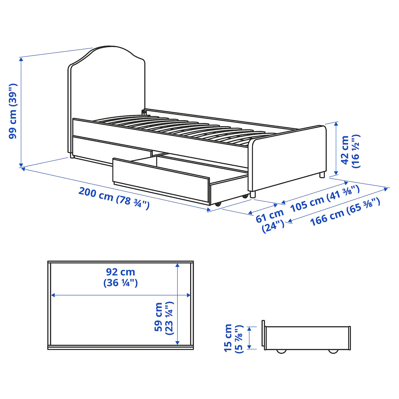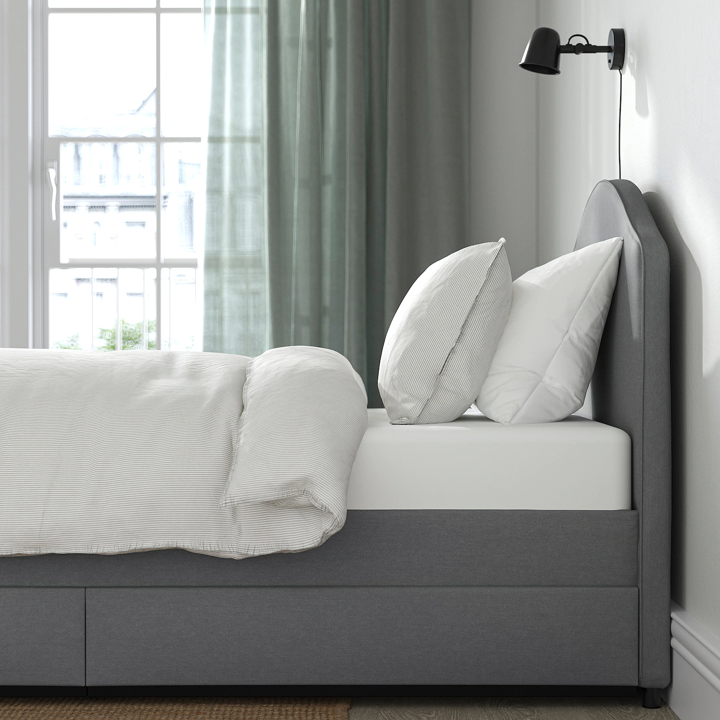Designed to coordinate perfectly with the rest of the HAUGA series, the upholstered bed frame adds a touch of softness to your bedroom, bringing comfort during the night, and adding style around the clock. The storage boxes are easy to roll out and in thanks to the castors on the base. The soft, padded headboard is comfortable to lean against while reading or watching TV in bed. A timeless look with soft upholstery, gentle curves and piping on the headboard and footboard. The VISSLE cover is soft to touch and made from recycled polyester.Material