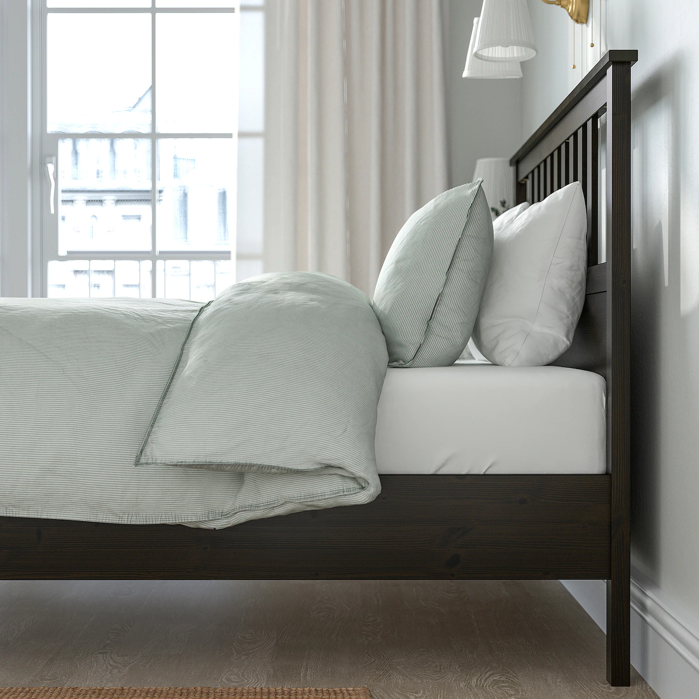 You can sit up comfortably in bed thanks to the high headboard – just prop some pillows behind your back and you will have a comfortable place to read or watch TV. Beautiful craftsmanship all the way around. Why not place it in the middle of the room to create impact? There’s plenty of space under the bed for storage boxes – great for stowing extra quilts and sheets. The high footboard keeps bed textiles from falling onto the floor while you sleep. Adjustable bed sides allow you to use mattresses of different thicknesses. 17 layer-glued slats adjust to your body weight and increase the suppleness of the mattress.Material