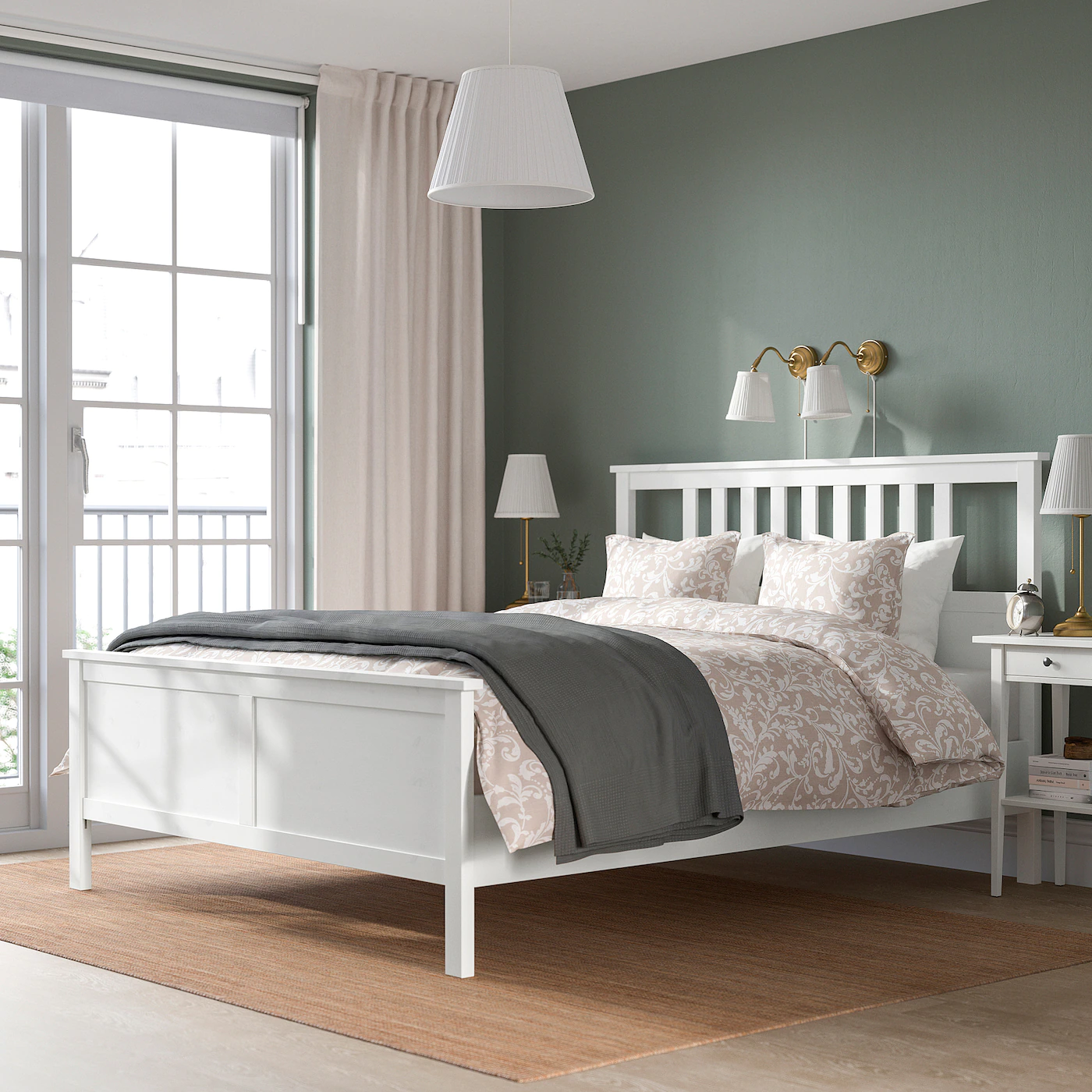 The sturdy solid pine frame has natural variations in grain, color and texture, giving every piece a unique look. And it has been stained and lacquered making it more durable and easy to care for. You can sit up comfortably in bed thanks to the high headboard – just prop some pillows behind your back and you will have a comfortable place to read or watch TV. Beautiful craftsmanship all the way around. Why not place it in the middle of the room to create impact? There’s plenty of space under the bed for storage boxes – great for stowing extra quilts and sheets. The high footboard keeps bed textiles from falling onto the floor while you sleep. Adjustable bed sides allow you to use mattresses of different thicknesses. 30 slats adjust to your body weight and increase the suppleness of the mattress.Material