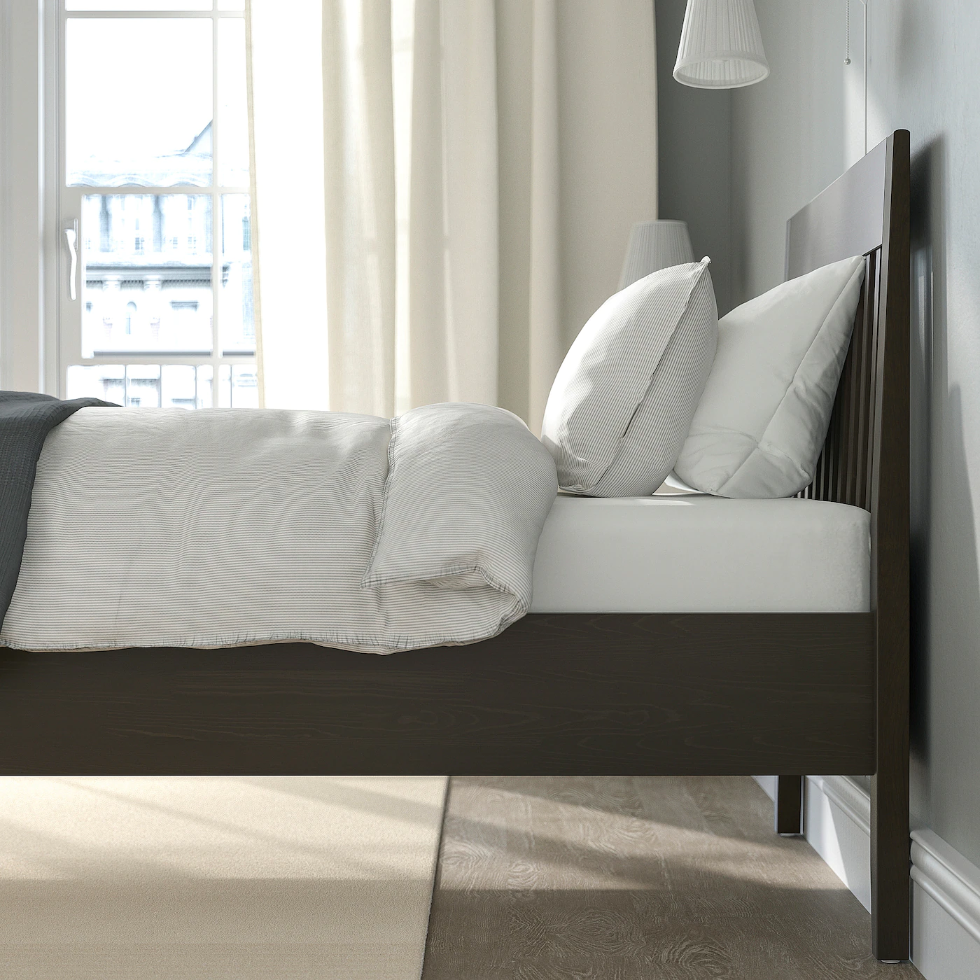 You can easily vacuum under the bed frame to keep the space clean and dust-free. There’s plenty of space under the bed for storage boxes – perfect for storing extra quilts and pillows. Adjustable bed sides allow you to use mattresses of different thicknesses. Easy to put together thanks to a simplified assembly process with fewer steps and hardware. Wood veneer gives you the same look, feel and beauty as solid wood with unique variations in grain, color and texture. The layer-glued slats adjust to your body weight and makes the mattress more supple and comfortable. The solid wooden spindles and tapered legs express craftsmanship.Material