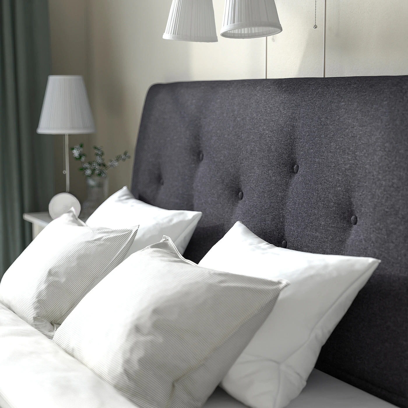 IDANÄS upholstered bed frame has a thick, sloping headboard that provides comfortable support for your back – perfect for lazy mornings and long evenings when reading a newspaper or a thrilling book in bed.