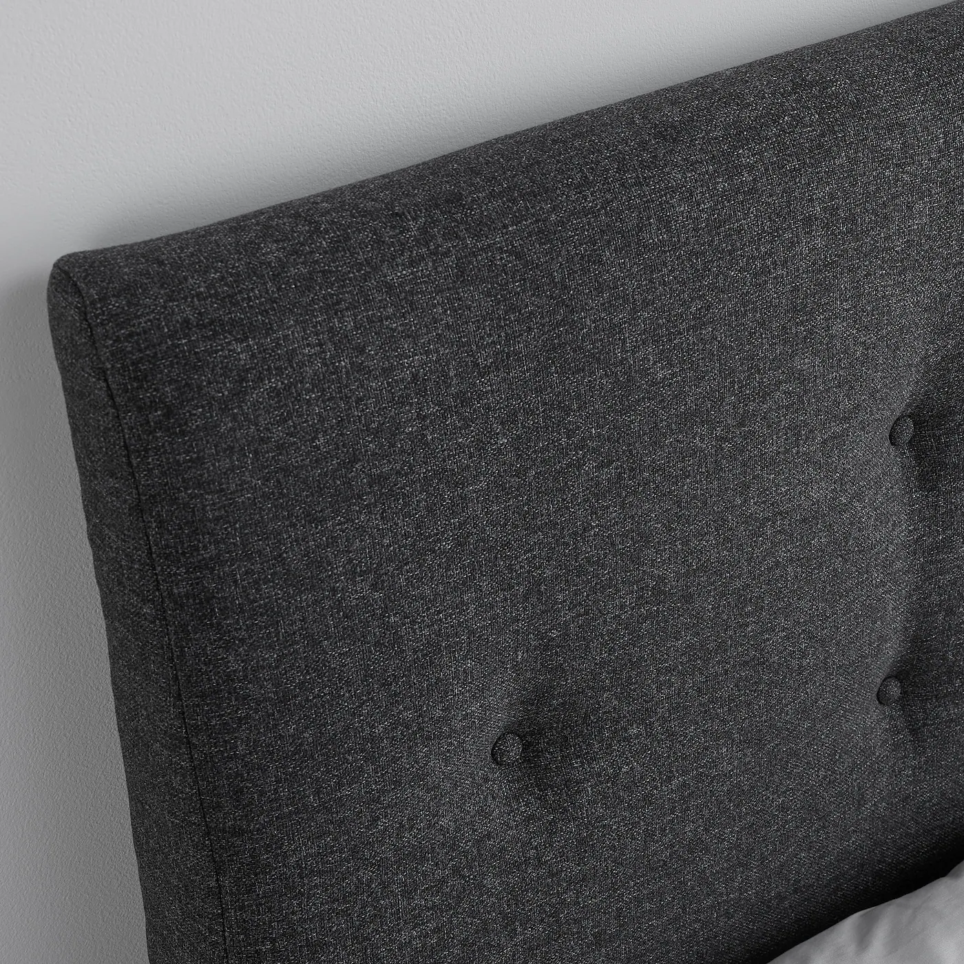 IDANÄS upholstered bed frame has a thick, sloping headboard that provides comfortable support for your back – perfect for lazy mornings and long evenings when reading a newspaper or a thrilling book in bed.