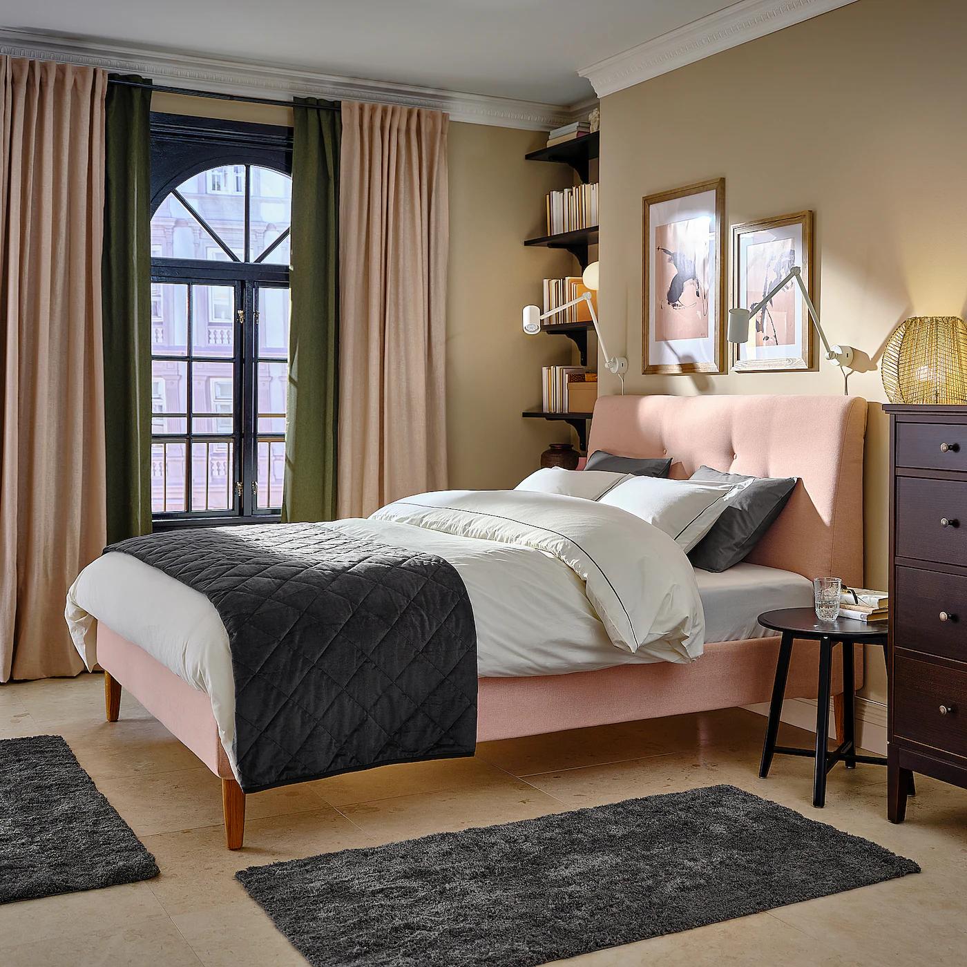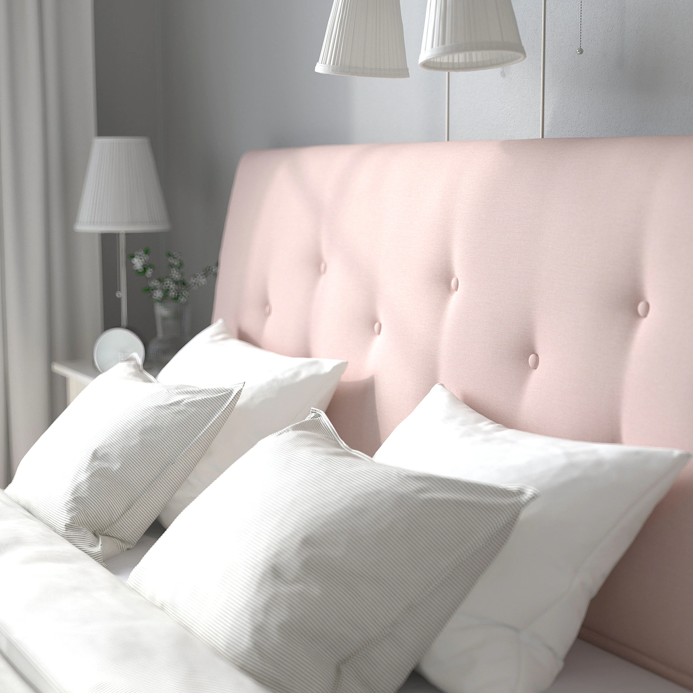Classic button detailing makes the headboard eye-catching in any bedroom. The upholstery is soft to the touch and makes bedtime even cozier. The solid wooden legs are strong and sturdy – and complement the classic design. Create a coordinated bedroom by combining this bed frame with other furniture from the IDANÄS series. Easy to put together thanks to a simplified assembly process with fewer steps and hardware. GUNNARED fabric in soft pink helps create a calm atmosphere in the bedroom. There’s plenty of space under the bed for storage boxes – perfect for storing extra quilts and pillows. You can easily vacuum under the bed frame to keep the space clean and dust-free. Adjustable bed sides allow you to use mattresses of different thicknesses.Material
