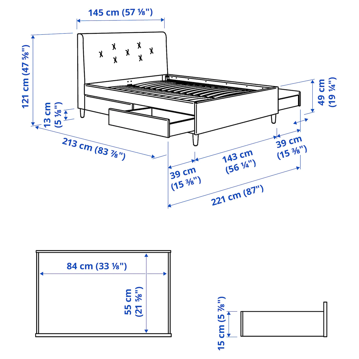 4 spacious drawers under the bed make the best use of the space. They are great for storing extra quilts, pillows, and bed linens – or your clothes. The drawers open and close silently and softly, so you can use them without waking up your partner. Classic button detailing makes the headboard eye-catching in any bedroom. The upholstery is soft to the touch and makes bedtime even cozier. The solid wooden legs are strong and sturdy – and complement the classic design. You can easily vacuum under the bed frame to keep the space clean and dust-free. Adjustable bed sides allow you to use mattresses of different thicknesses. Create a coordinated bedroom by combining this bed frame with other furniture from the IDANÄS series. GUNNARED dark gray fabric is durable and gives the bedroom a timeless style.Material