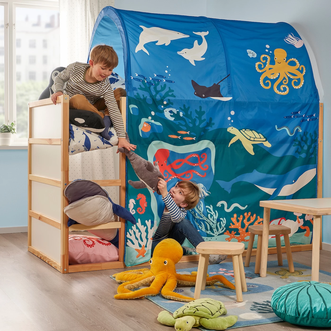 The colorful underwater world is just as enchanting on the outside as on the inside since the tent’s recycled polyester material is transparent.