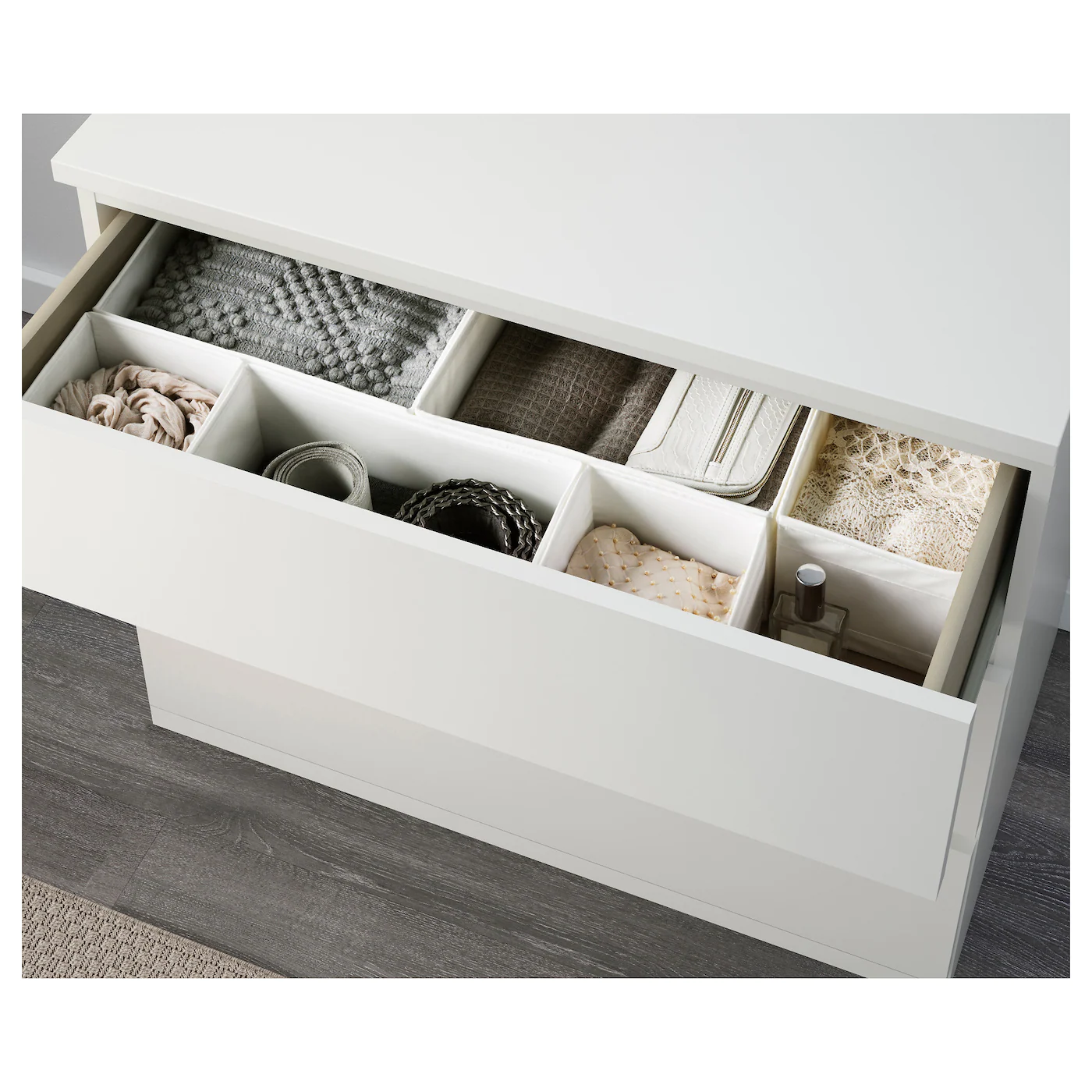 The 3 drawers in MALM chest are deep and offer a generous storage capacity. The sleek design with integrated handles never goes out of style.Material