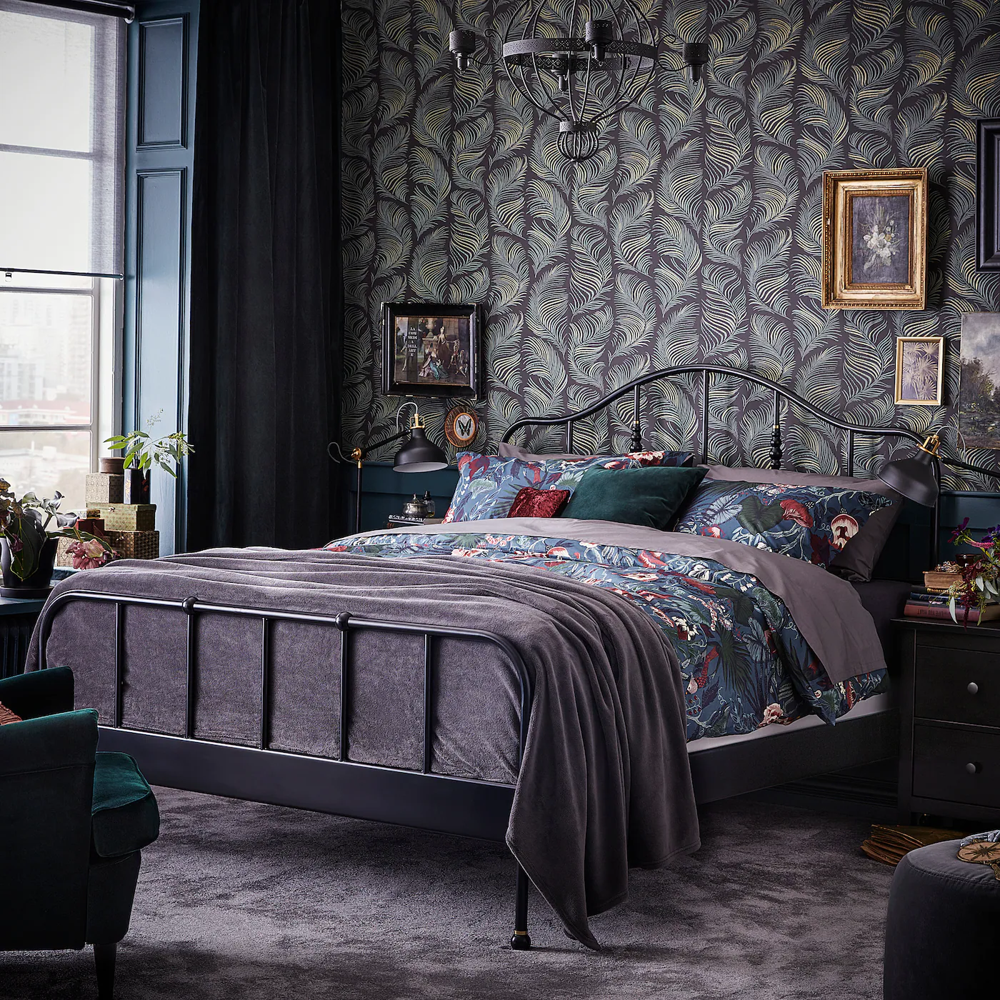The powder-coated steel frame is strong, sturdy and easy to maintain. You can sit up comfortably in bed thanks to the high headboard – just prop some pillows behind your back and you will have a comfortable place to read or watch TV. There’s plenty of space under the bed for storage boxes – great for stowing extra quilts and sheets. You can choose the mattress comfort that’s best for you – the high headboard and footboard work well with mattresses of different thicknesses. The high footboard keeps bed textiles from falling onto the floor while you sleep. Whether you prefer bold or romantic, this versatile bed frame will look great with your choice of textiles and bedroom furniture.Material