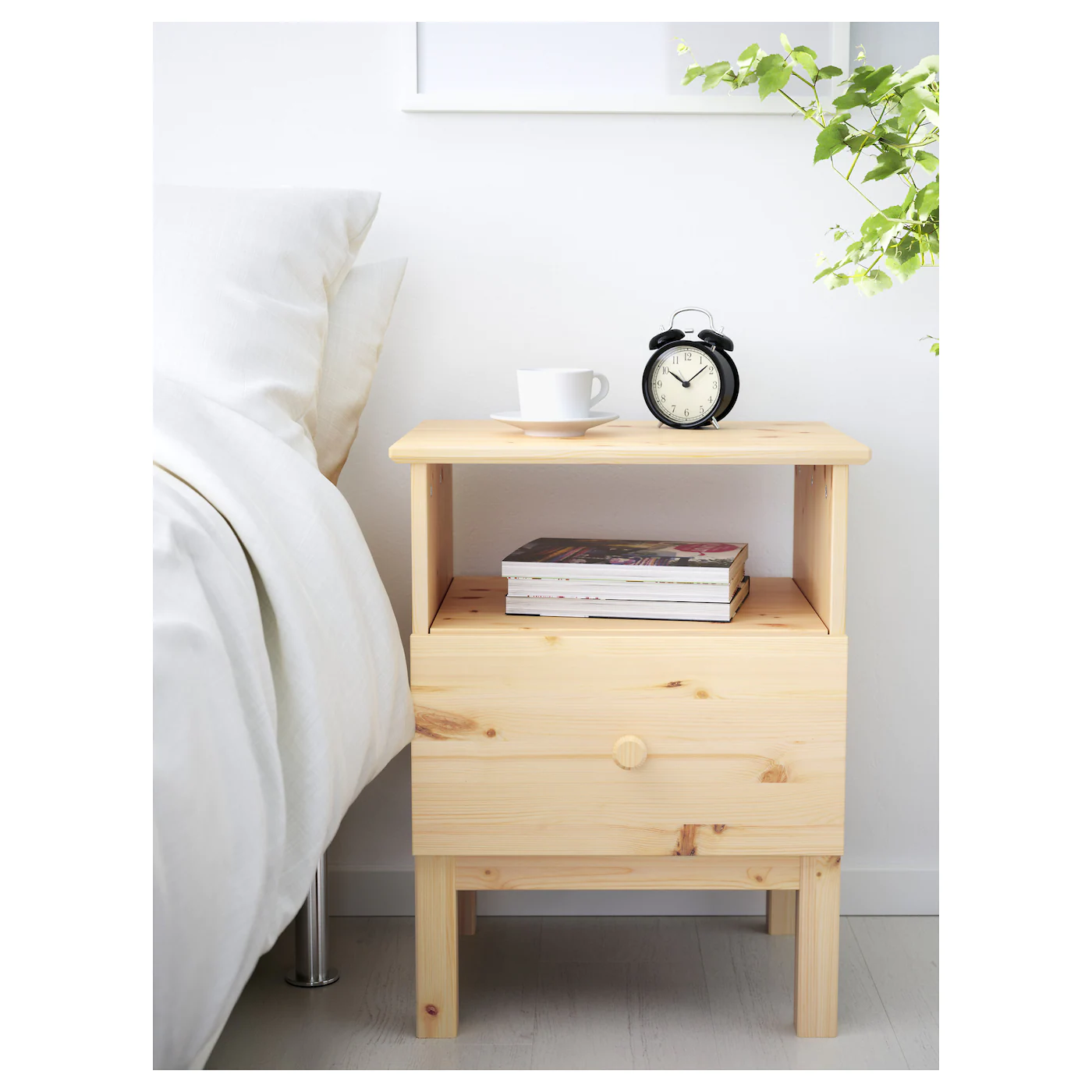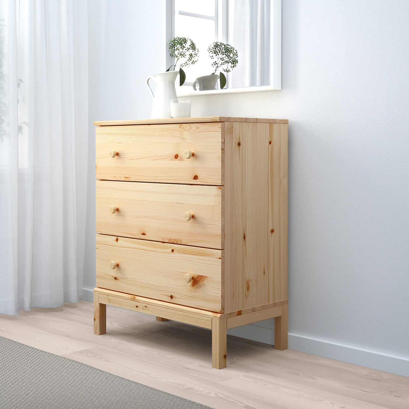 The hardwearing solid pine has natural variations in grain, color and texture – giving each piece a unique look. There’s plenty of space under the bed for storage boxes – perfect when space is limited. The bedside table has a top shelf, a handy drawer and an open storage compartment. Everything you need to store items that you want close to the bed. TARVA chest of drawers has 3 solid wooden drawers with matching knobs. With the same classic wooden expression as the bed frame and bedside table, it creates a coordinated look in your bedroom. TARVA is made of untreated solid wood. You can keep it as it is or stain, paint or wax it to create a personalized look, to update it – and love it for longer.Material