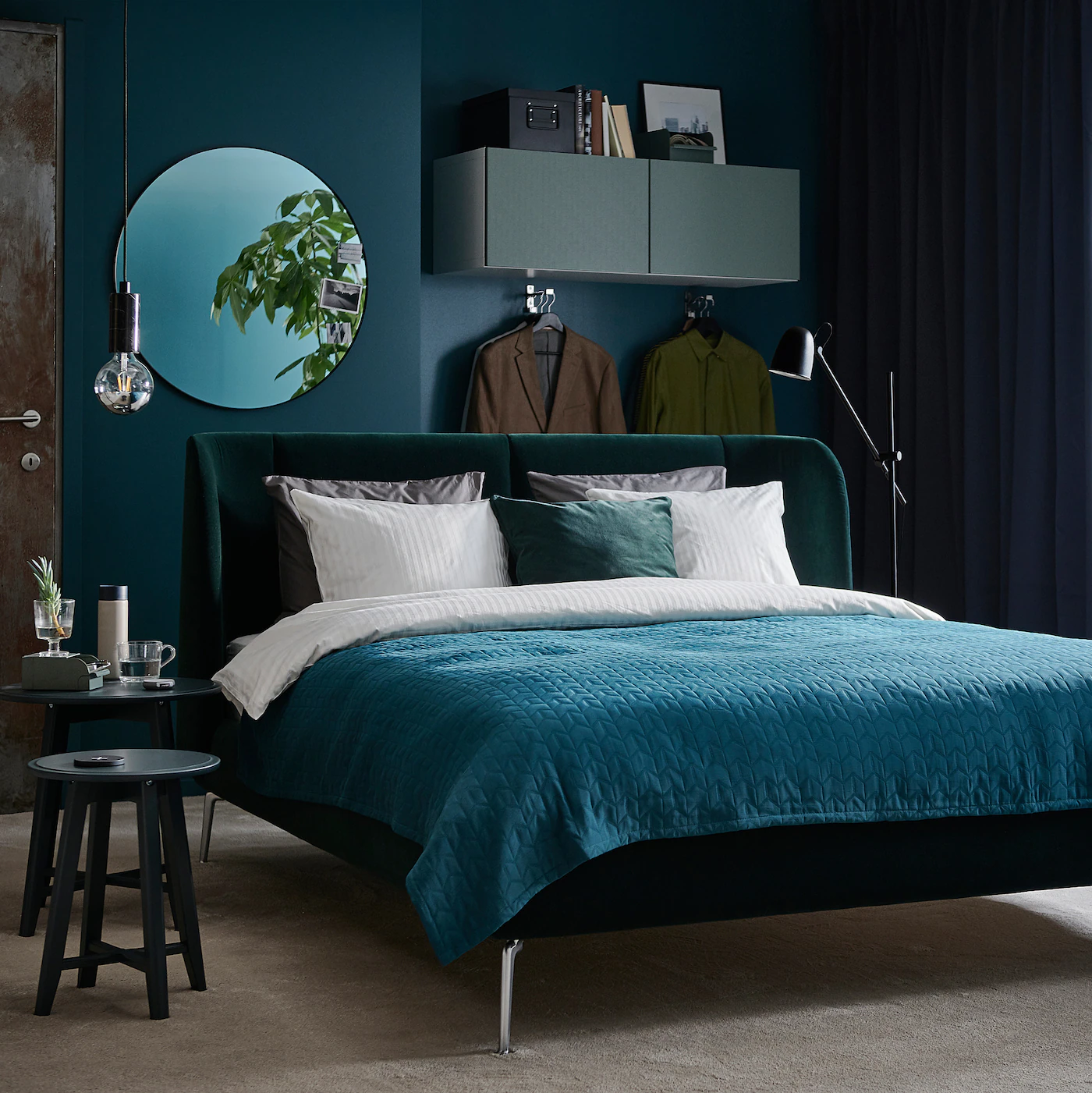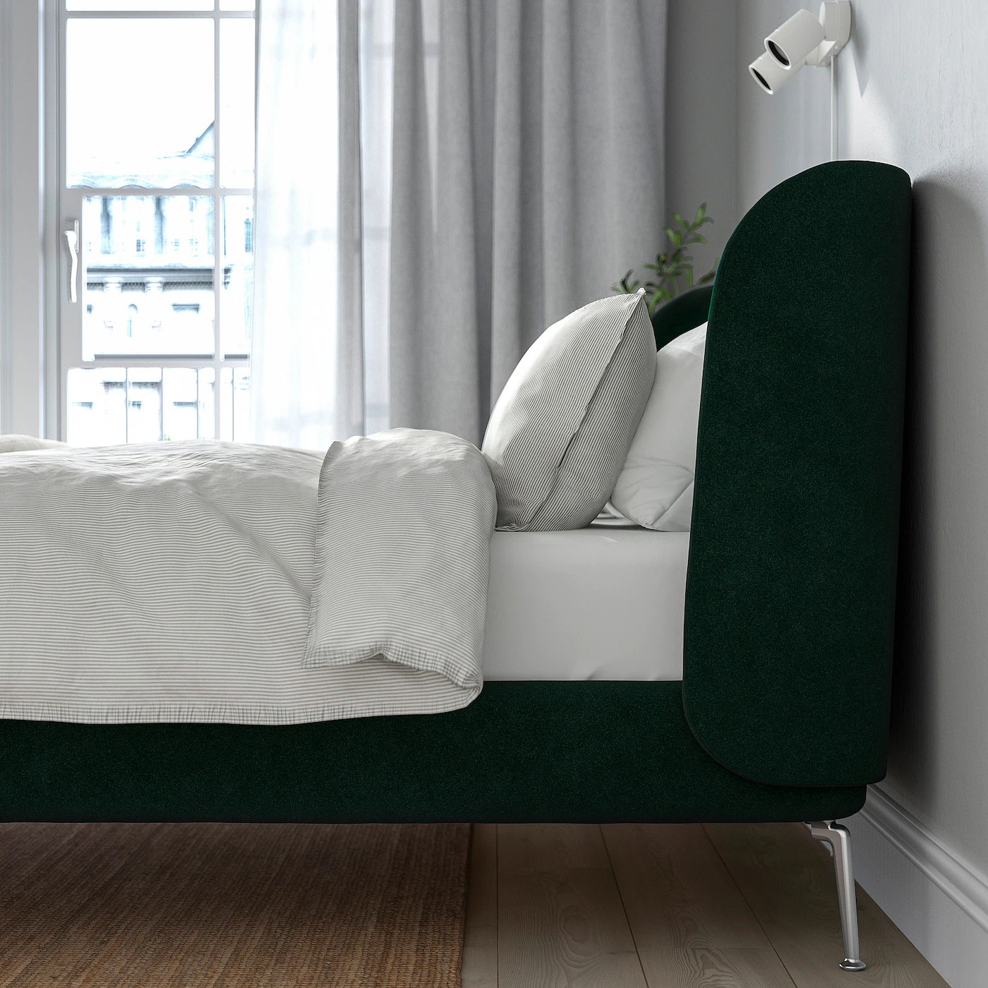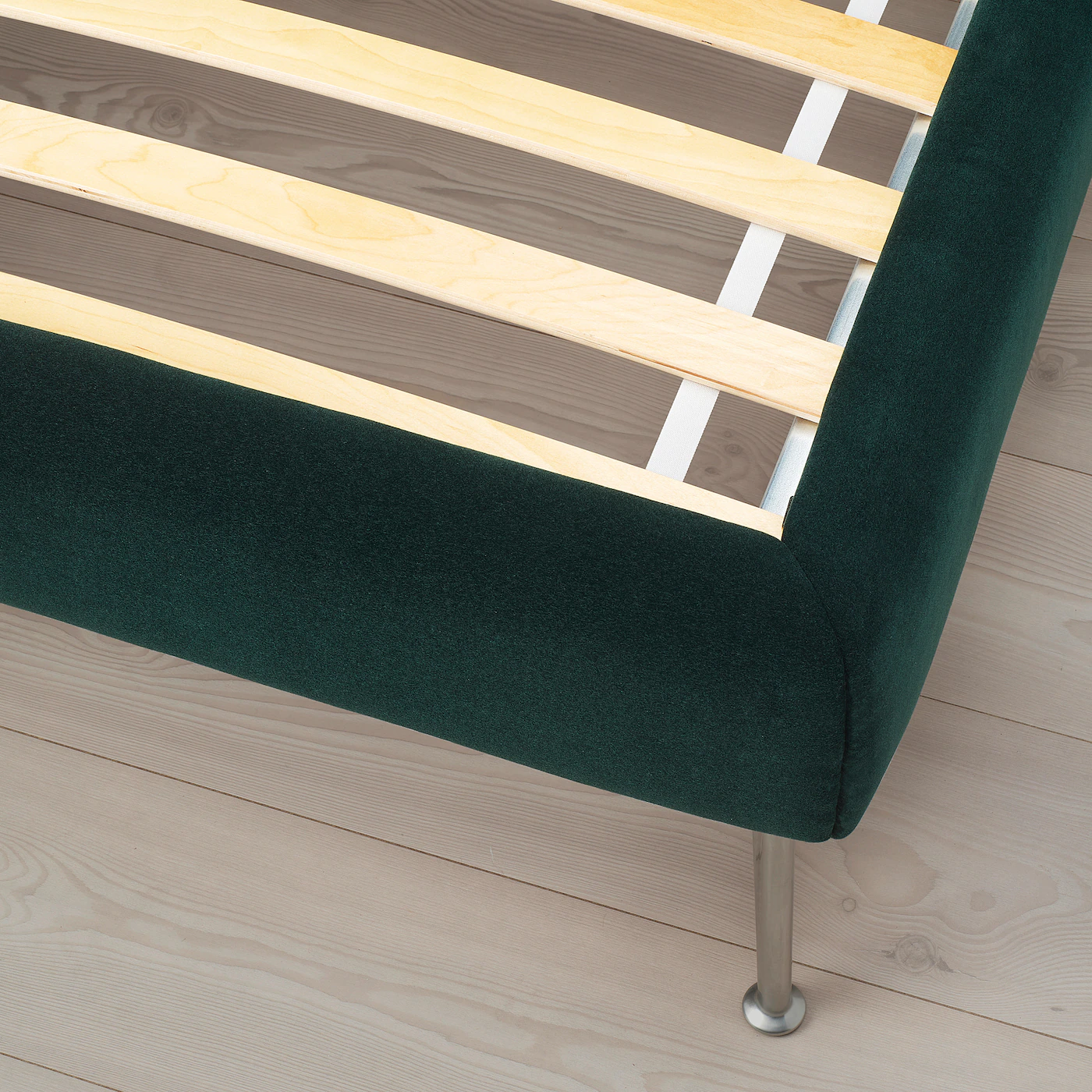 The headboard is comfortable to lean against ⎼ ideal for lazy mornings in bed drinking coffee and reading. The upholstery has a perfect fit all around the bed, making it pleasing to look at from all angles and great to position in the center of a room. The velvet upholstery feels soft against the skin and has a beautiful luster. The velvet is woven from viscose and polyester, which makes it durable. The shaped metal legs are strong and stable and add to the bed´s character. There’s plenty of space under the bed for storage boxes – perfect for storing extra quilts and pillows. You can easily vacuum under the bed frame to keep the space clean and dust-free. Adjustable bed sides allow you to use mattresses of different thicknesses.Material