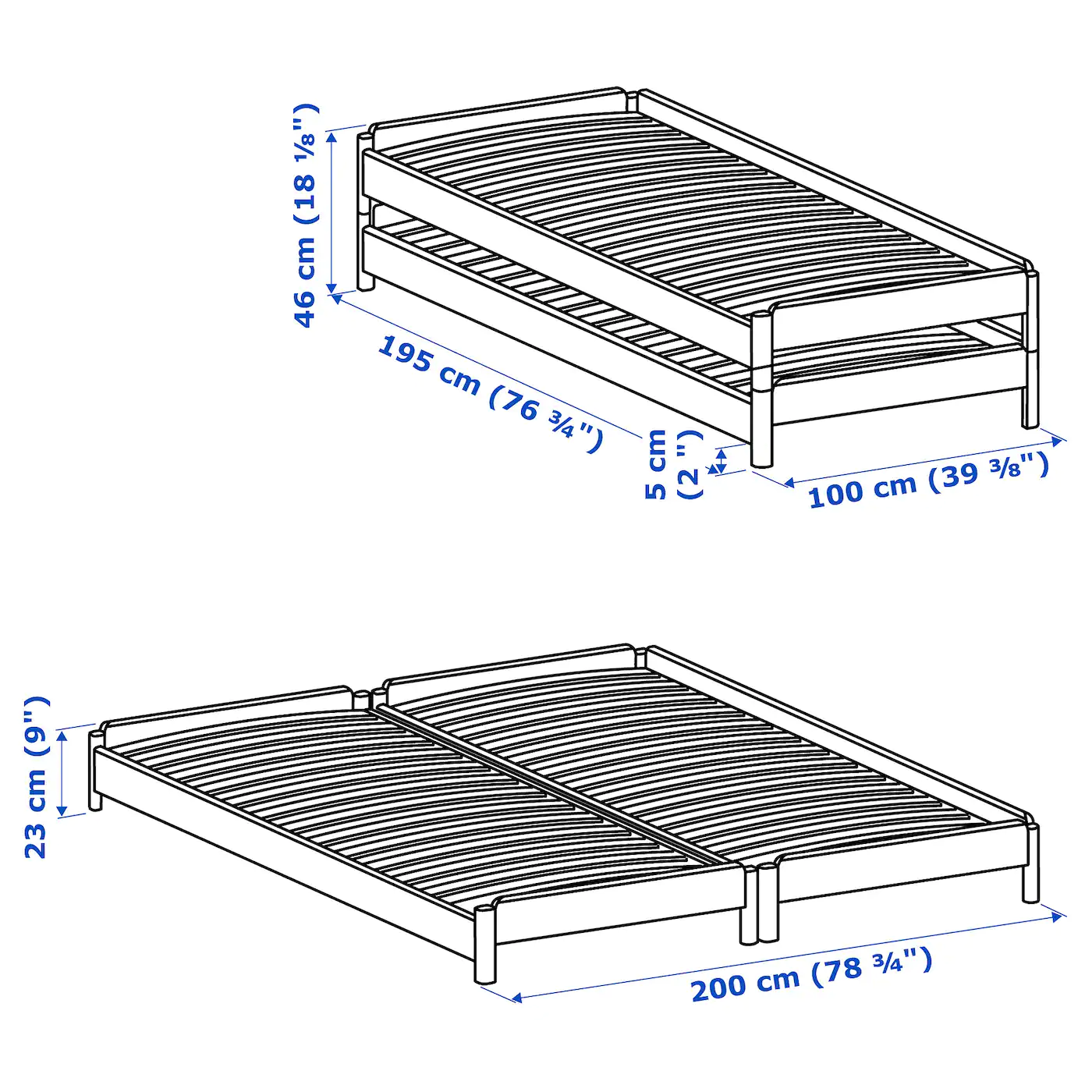 The lightweight frames are easy to lift and move. The compact design is perfect for tight spaces or under low ceilings, so you can make the most of your available space. The stacked beds sit evenly since the upper bed has small plastic feet which fit into holes on the lower bed. Untreated pine is a sustainable material with natural variations which gives every piece of furniture a unique look. With glazing paint, oil or paint, you can easily make the surface more durable – and your furniture more personal. The pocket springs move independently and provide support exactly where you need it.Material