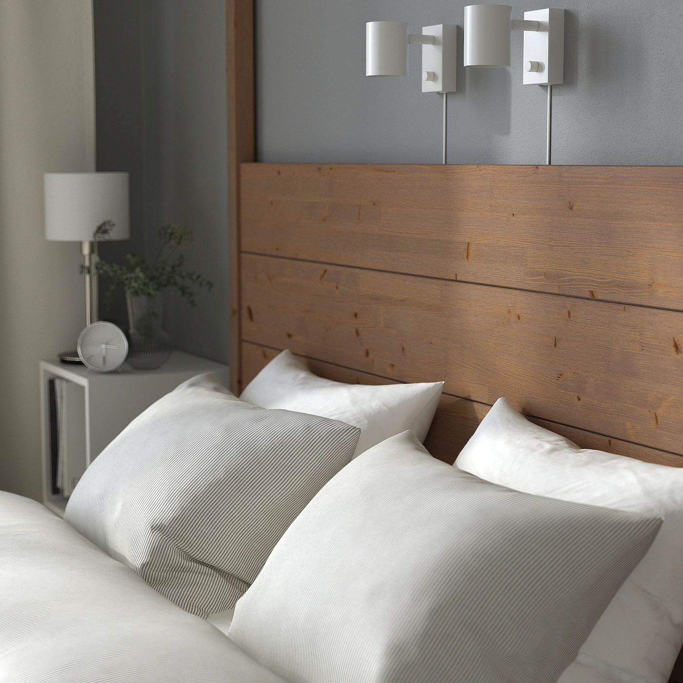 Adjustable bed sides allow you to use mattresses of different thicknesses. You can sit up comfortably in bed thanks to the high headboard – just prop some pillows behind your back and you will have a comfortable place to read or watch TV. The headboard in solid wood is sturdy to lean against and can serve as a room divider. The hard-wearing solid pine has natural variations in grain, color and texture, giving every bed a unique look. The slatted bed base has 17 layer-glued slats that adjust to your body weight and increase the suppleness of the mattress.Material